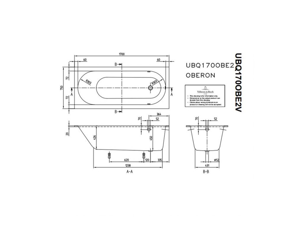Villeroy & Boch Oberon Solo - Vaňa 1700x750 mm, Quaryl, vrátane nôh (samolepiace), alpská biela