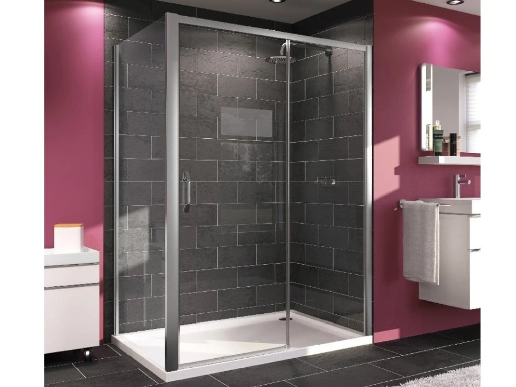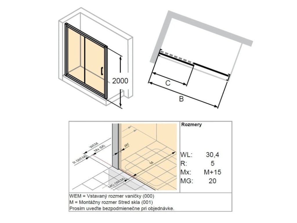 Čiastočne orámované sprchové dvere s 1 posuvným segmentom a 1 pevným segmentom pre montáž do niky alebo pre kombináciu s bočnou stenou.