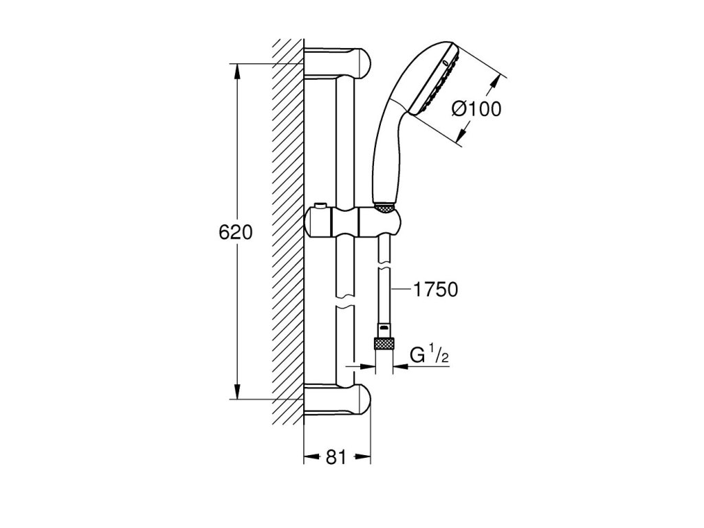 - Súprava obsahuje: ručná sprcha Vitalio Go 100, sprchová tyč 620 mm, sprchová hadica Vitalioflex Trend 1750 mm 1/2" x 1/2"