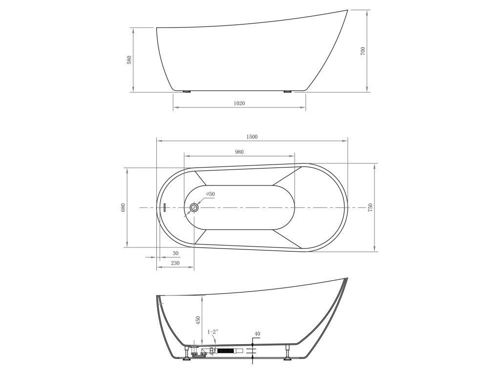 AquaLine DOURO voľne stojaca vaňa do priestoru 150x80cm, faba biely akrylát