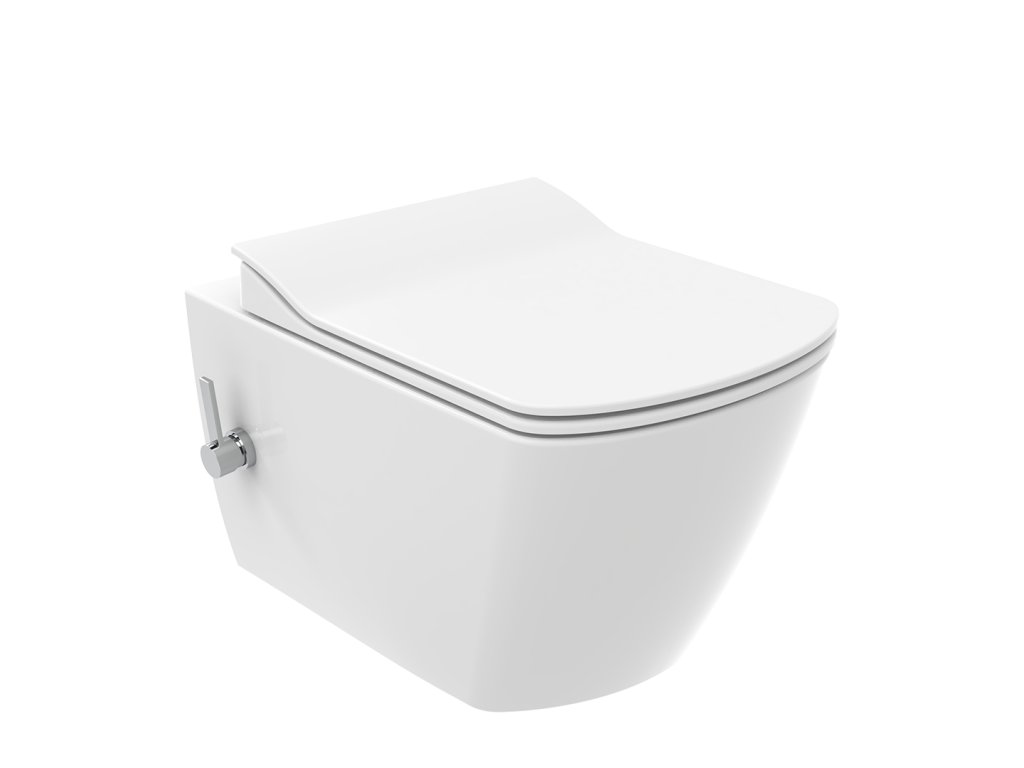 Spája v sebe toaletu a bidet v jednej keramike. Ide o model vyššej triedy závesných WC+BIDET 2v1. Jeho moderný hranatejší vzhľad bude ozdobou každej modernej kúpeľne. Naviac disponuje tento model systémom splachovania bez oplachovacieho kruhu Rimless- Rim-OFF. Ďalšou výhodou je skrytá montáž a možnosť úsporného splachovania 3/6 litrov vody. Jedná sa o moderné WC s bidetom, ktoré v sebe spája všetky výdobytky modernej doby.